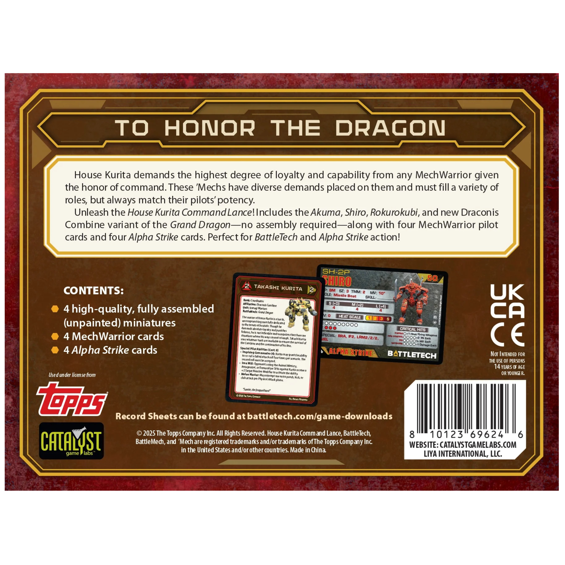 Unlease the House Kurita Command Lance! This Force Pack includes the Akuma, Shiro, Rokurokubi, and the new Draconis Combine variant of the Grand Dragon, along with four MechWarrior pilot cards and four Alpha Strike Cards.