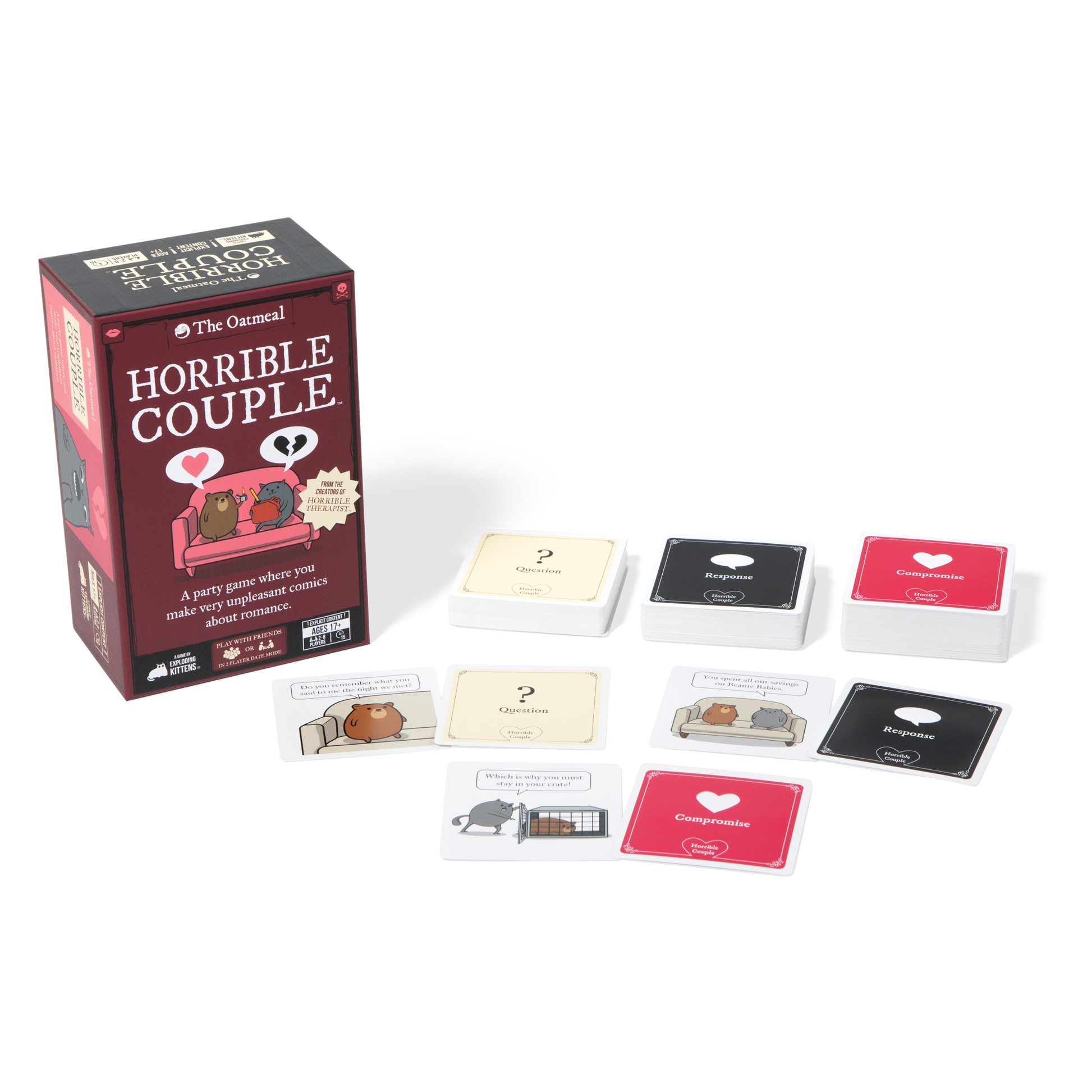 Horrible Couple is an unfiltered couples card game about love, laughs, and terrible decisions. Created by The Oatmeal and Exploding Kittens, it turns romance into ridiculous three-panel comics where the best (or worst) punchline wins.
