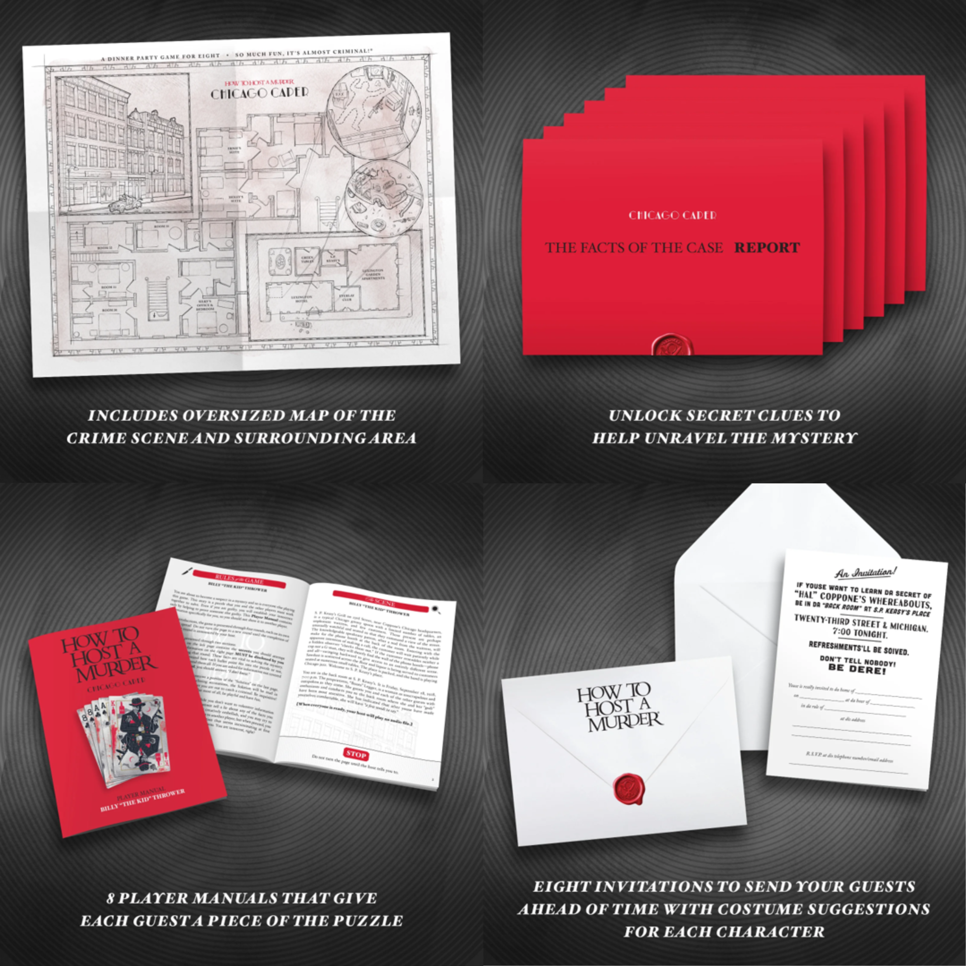In the Chicago Caper, you find yourself in the Chicago private club of S.P. Keasy, near the headquarters of notorious gangster “Hal” Coppone. Take up the part of one of these eight shady characters. Enjoy hours of suspense and intrigue as you imagine your home is a speakeasy in 1920s Chicago.