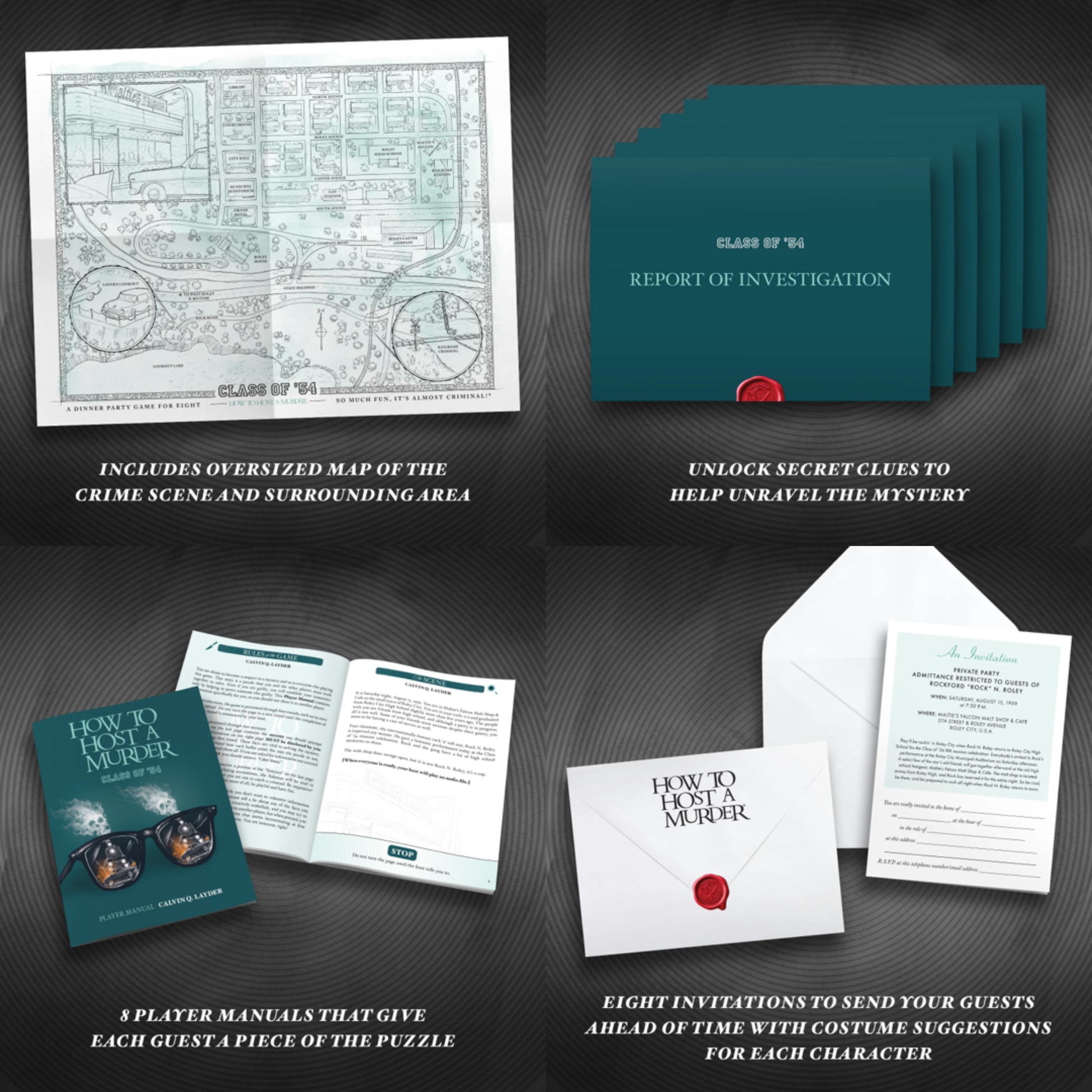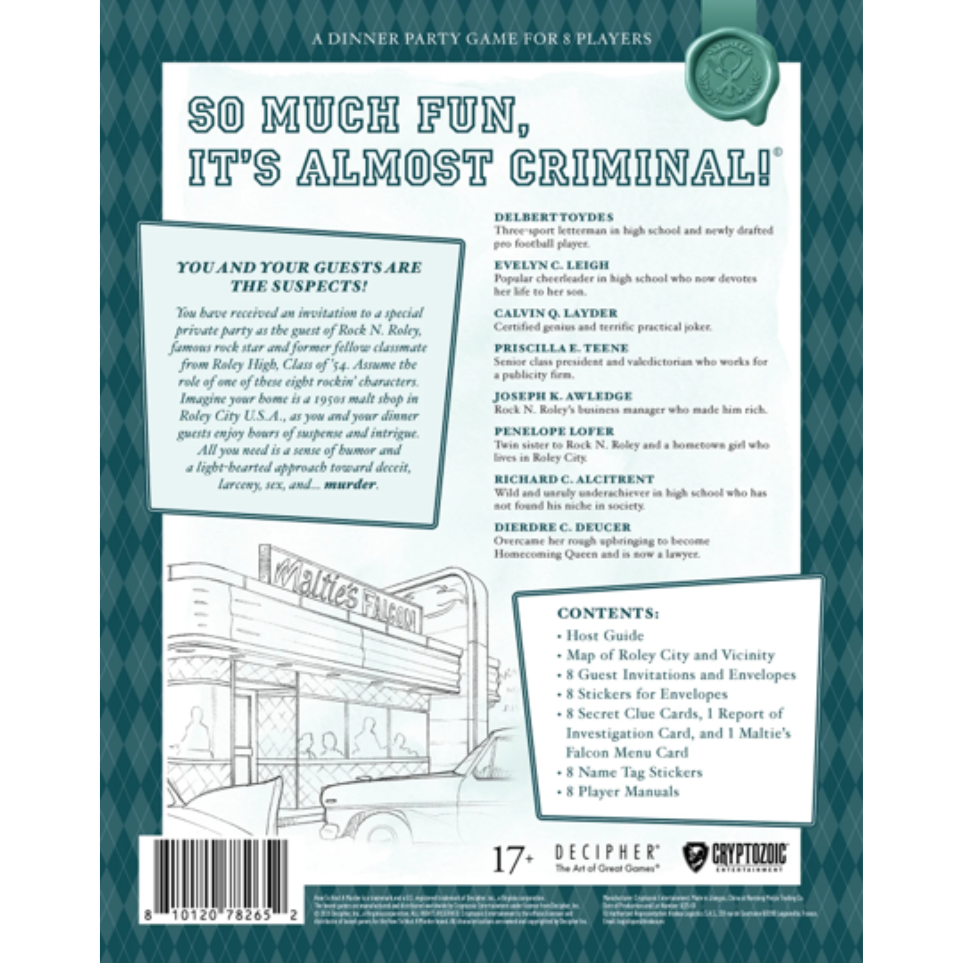 In the Class of '54, you are headed to a special private party as the guest of Rock N. Roley, famous rock star and former fellow classmate from Roley High, Class of ’54. Step into the shoes of these eight rockin’ characters. Imagine your home is a 1950s malt shop in Roley City U.S.A., as you and your dinner guests enjoy hours of suspense and intrigue.