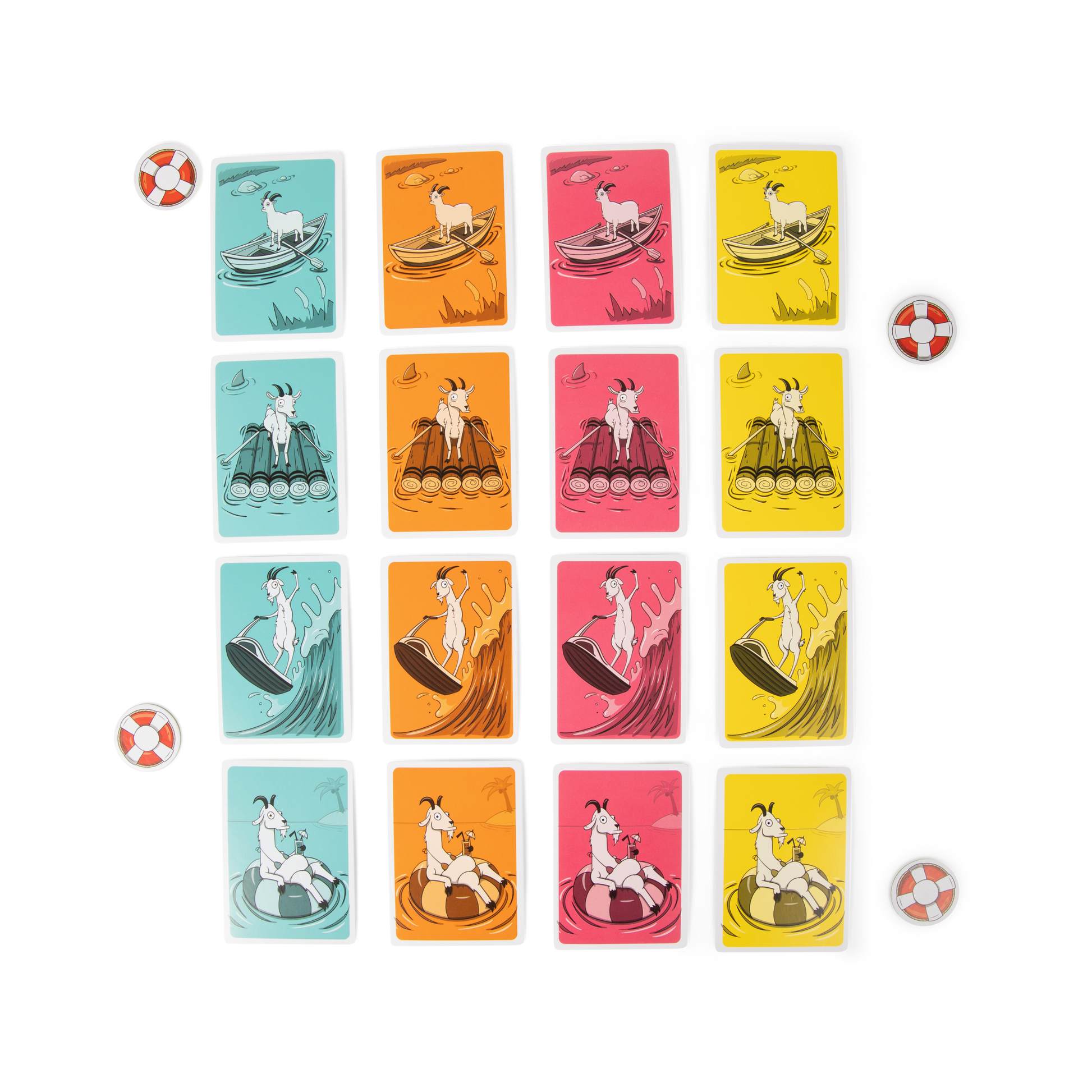 Row Your Goat is a rapid-fire picture-matching, fast slapping game. Get rid of your cards by placing them in a grid. The second you see a matching set of 3 in a row, slap the nearest Lifesaver. Hurry, there's only a few of them. And if you don't grab one fast enough, you're left collecting cards. When you're down to one card, scream “ROW MY GOAT”, play your card, and slap a Lifesaver to win.