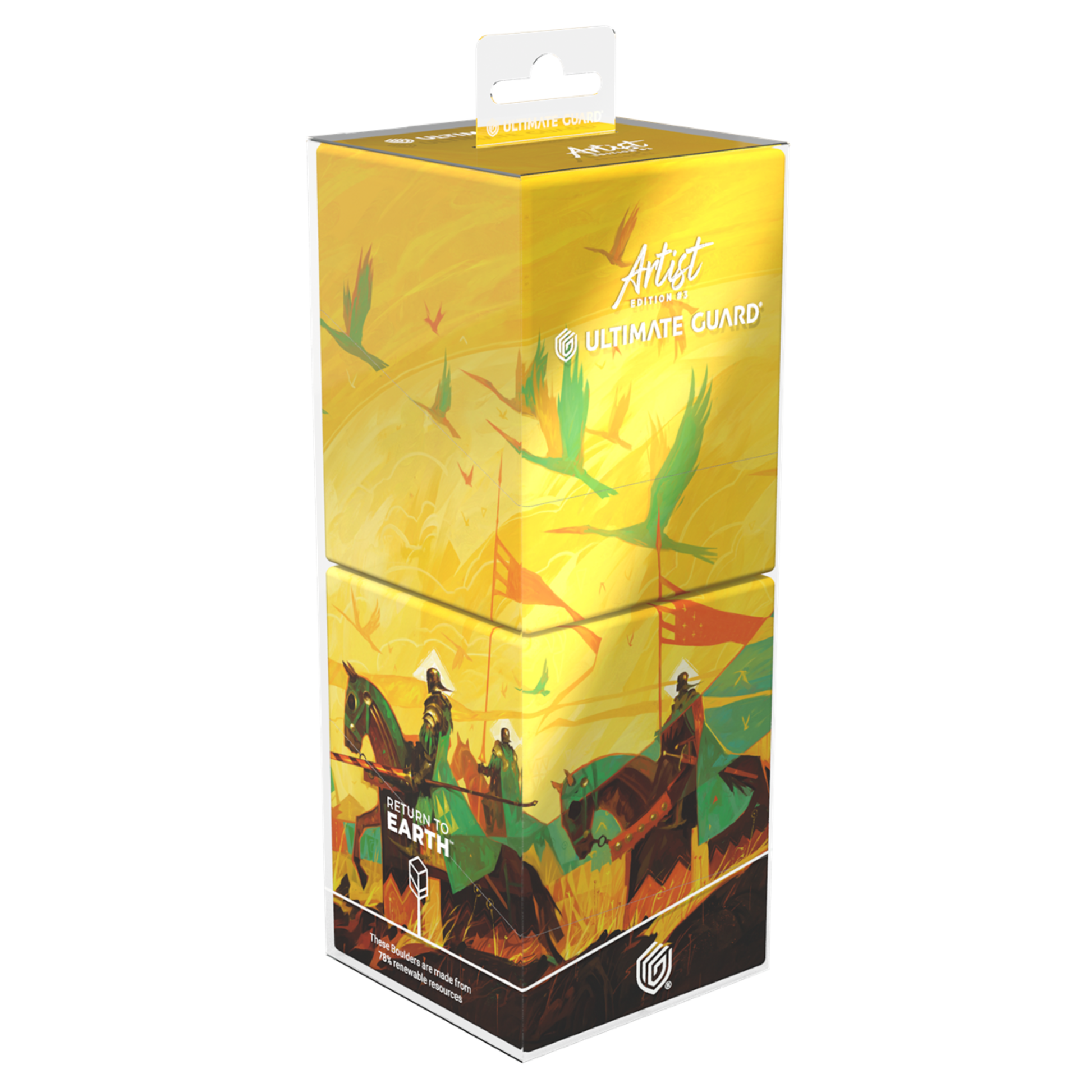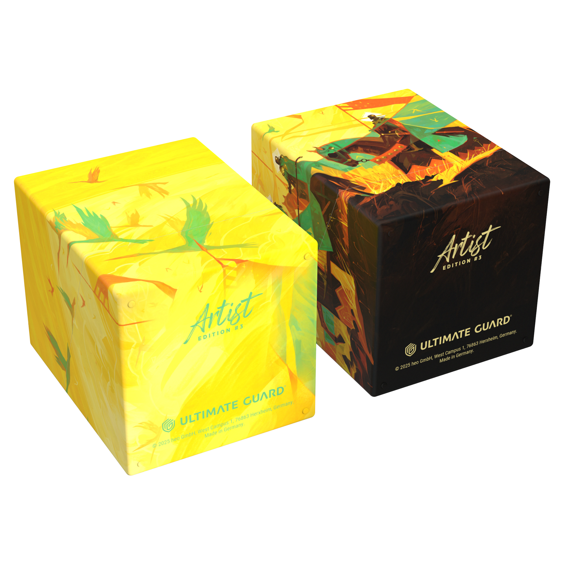 Ultimate Guard's RTE Boulder 100+ deck boxes are durable, reliable, and made in Germany from 78% renewable resources. Despite their secure closure, they remain easy and convenient to open. Each deck box holds 100 double-sleeved cards in Ultimate Guard sleeves*, making them an ideal choice for trading card games like Magic: The Gathering, Pokémon, Lorcana, Flesh and Blood, Yu-Gi-Oh!, and One Piece. The Artist Edition #3, designed by Magic: The Gathering artist Dominik Mayer, includes two RTE Boulder 100+ deck boxes that combine to reveal the full artwork.